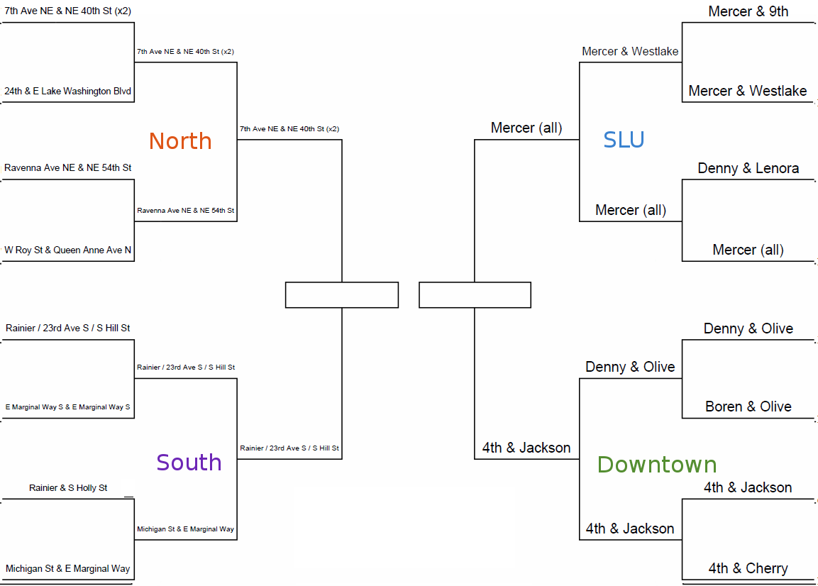 We’re now down to four options for the Worst Intersection in Seattle, which is the worst intersection for pedestrians, cyclists, and transit riders as voted by readers of The Urbanist. Based on this year’s seeding, voters have identified a worst intersection in each part of Seattle (North, South, South Lake Union, and downtown).