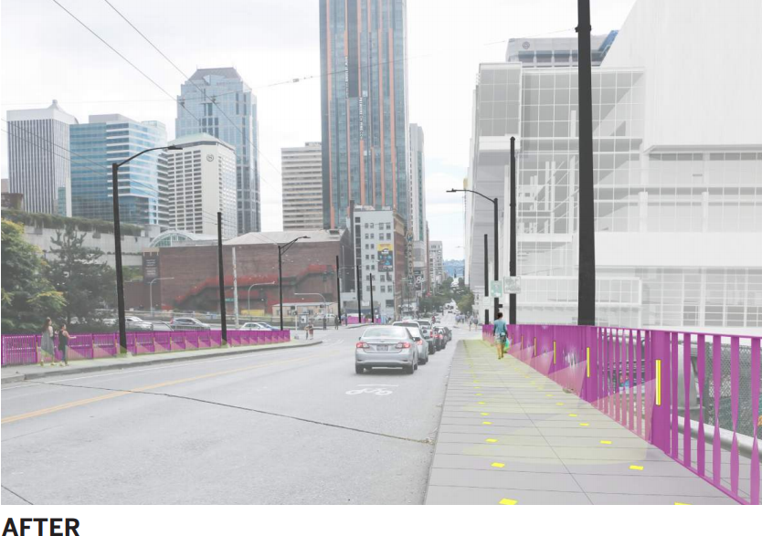A clear goal of the Community Package Coalition–a collective of nine community groups–is focused on improving bicycle and pedestrian connections on Pike/Pine St. The problem is those streets cross I-5 and intersect on- and off-ramps with conflict points abounding. Advocates may win support for a protected bike lane–effectively WSCC punted the bike network decision to One Center City–but it’s challenging to design a safe facility that must cross busy freeway on- and off-ramps, and same goes for pedestrians.