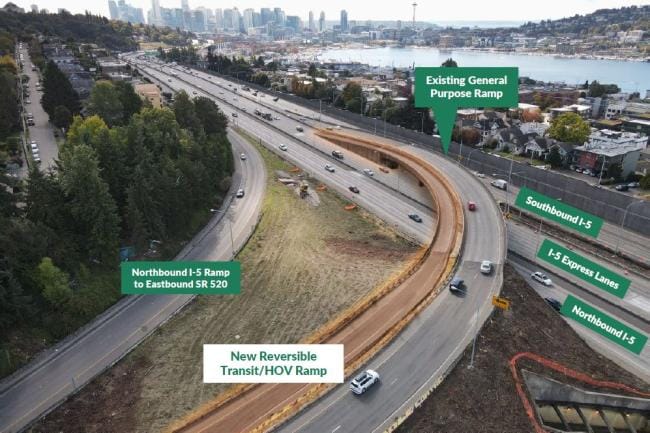 The new reversible lane, which will be run in the same direction as the I-5 express lanes, was originally set to open to buses only in 2023, per an agreement signed in 2021 between WSDOT, Sound Transit, King County Metro, and the Seattle Department of Transportation. But even though WSDOT’s project website still touts the benefits of accelerating the project’s timeline from 2029 to 2023, what was downplayed was the fact that the ramp would always need to close for construction of the new Portage Bay Bridge and Roanoke Lid project in 2024. Once the new bridge and north Capitol Hill highway lid are complete, the ramp will open to all high-occupancy vehicles (HOVs), including buses and carpools.