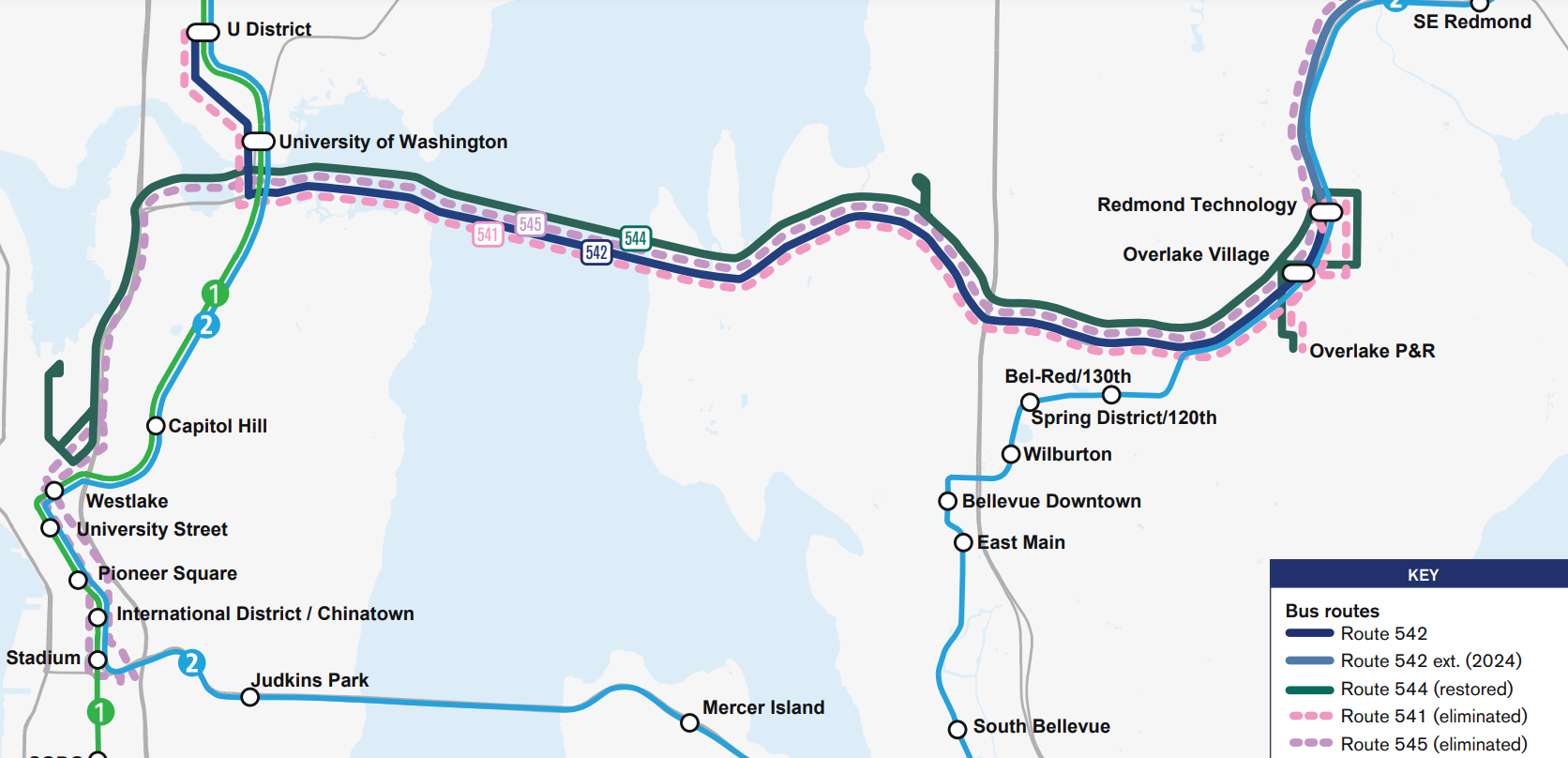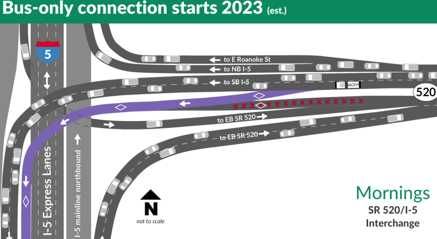 Currently, no buses connect directly from SR 520 to I-5’s Mercer Street exit, the pathway envisioned for this new ramp. King County Metro’s future Route 256 bus, planned in conjunction with East Link, would be the first bus to use this connection, directly running from Woodinville to South Lake Union with stops in Kirkland and Medina during peak commuting hours only, in one direction only.